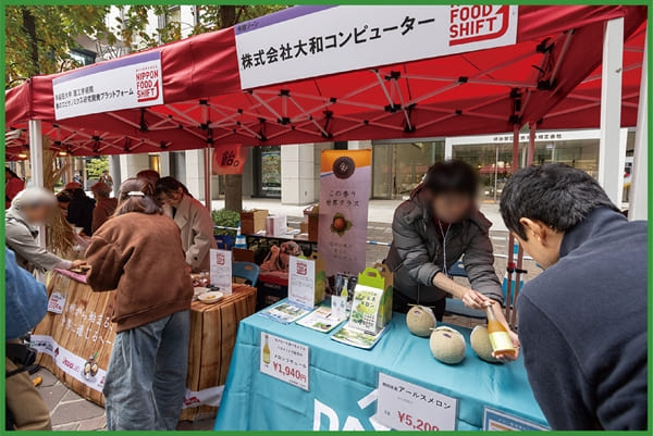 独自に開発した生産システムの一部を紹介するとともに、そのシステムを活用して育てたメロンや、メロンを使ったリキュール、関連する加工品を展示。日本の食に関心を持つ家族連れや海外からの来場者が多く訪れ、特に海外の方々は日本産メロンへの関心が高く、熱心に質問される姿が印象的でした。子どもたちには実際にメロンに触れてもらい、成長の過程でできる網目の仕組みを説明すると、驚きの声が上がる場面も。生産から加工までの取り組みを知っていただく、にぎやかなひとときとなりました。