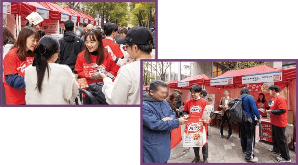 読売新聞と農林水産省、カルビー、旭化成ホームプロダクツなどが参画する「朝から日本を考える。」プロジェクトもブースを出展し、朝ごはんの大切さや、朝食欠食が抱える社会課題について来場者へ向けて発信しました。カルビーは「100 年朝食プロジェクト」の取り組みとして「フルグラ®」をサンプリング。長年の愛用者から「今日初めて食べる」という方まで幅広い反応が寄せられ、2 日間で約2,250 個が配布されるなど、注目を集めていました。