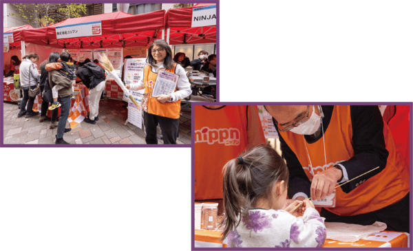 体験ブースでは、子どもたちが国産農産物の収穫に挑戦しました。初日は畑でサツマイモ掘りを行い、土の感触を楽しみながら収穫の工程を体験。2 日目は雨天のためテント内で千葉県産の梨のもぎ取りを実施し、収穫後に味わう果実の甘さに笑顔が広がりました。自分の手で収穫する体験を通し、子どもたちが地産地消への理解を深めるきっかけとなっていました。