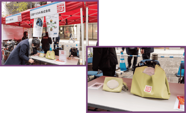 食と農のサステナビリティに向けた取り組みの一例として、食品包装材のリサイクルに関する活動が紹介されました。素材から循環を考える視点に、説明を聞きながら理解を深める来場者の姿が見られました。あわせて、天然樹木を主原料とし、同社が世界で唯一生産する素材「ソアロン™」も紹介。発色の美しさややわらかな風合いを生かしたエコバッグが数量限定で配布され、環境に配慮した素材を身近に感じる機会となっていました。