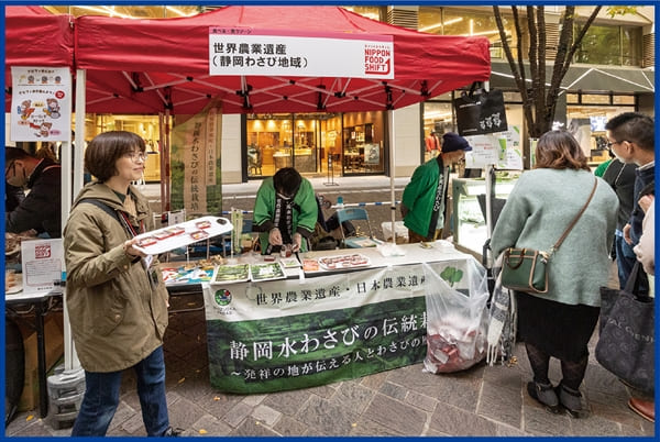 「農業遺産」は、農林水産業の営みそのものであり、社会や環境と調和しながら受け継がれてきた“生きた遺産” ともいえる存在です。今回は、その農業遺産に認定されている静岡県のわさび栽培地域がブースを出店。伝統的な技術で育てられた水わさびや、その加工品が並びました。静岡ならではのわさび文化を通して、来場者が農業遺産地域の魅力にふれるひとときとなりました。