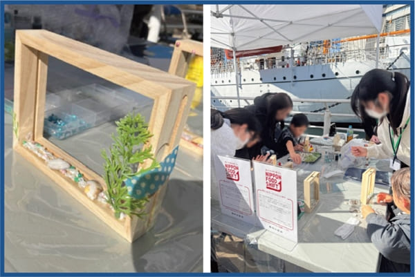 ブースCと共同出展で予想を上回る来場者でにぎわい、ワークショップは途中で材料の追加調達を行うほどの盛況となり、最終的には完売となりました。展示では、IYCJの団体・活動紹介に加え、国連機関であるIFADが進める漁業分野での取り組みを紹介し、足を止めて話を聞く来場者の姿も多く見られました。さまざまな団体によるワークショップや企画を通じて、来場者とともに国内外の漁業、ひいては日本の食について考える機会が広がりました。
