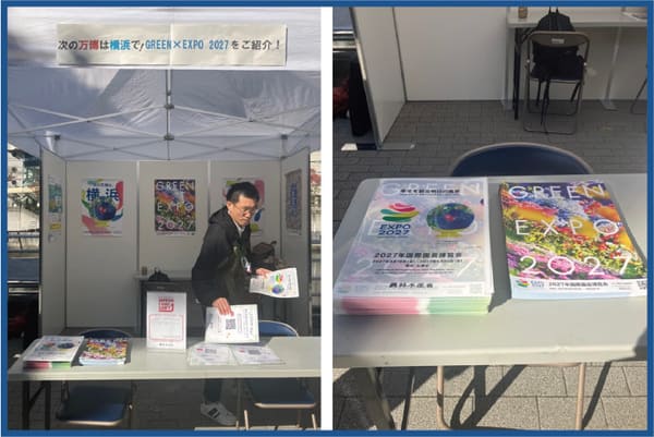 「次の万博は横浜で!GREEN×EXPO 2027をご紹介!」をテーマに、GREEN×EXPO 2027のチラシ配布を行い、あわせて農林水産省公式SNSをフォローした来場者へオリジナルグッズを配布しました。開催地が横浜であることもあり、ブースでは「GREEN×EXPOを知っている」「開催を楽しみにしている」といった声が多く聞かれ、関心の高さがうかがえました。