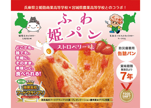 地域創生部ふわ姫パンは「どこでも·誰でも·手軽に·そのまま·美味しく」食べられる「5つのコンセプト」を取り入れたエシカル消費(地産地消·被災地支援·食品ロス·ゴミ削減)に基づいた災害用備蓄食品です。また、姫路市のふるさと納税返礼品に採用されており、食材には兵庫県の特産品である藤橋家の豊かなコク·深い味わいが特徴の「卵」、避難所での生活が長期化することを考え、女性や災害弱者に優しい宮城県産の糖度が高くてほどよい酸味があり、果汁も豊富な「苺」を使用しています。
