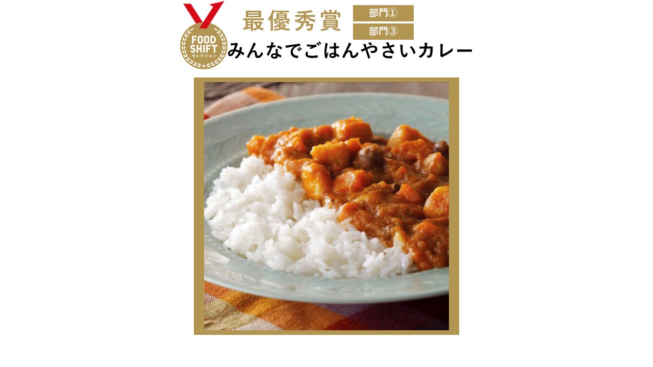 FOOD SHIFT セレクションにて異例の2部門で最優秀賞を受賞した本商品は、消費者庁が表示の対象とするアレルギー食品28品目を一切使用していません。食品添加物·動物性タンパク質不使用、使用している油はオリーブオイルのみで、脂質控えめ·ノンコレステロール食品です。主原料には北海道産の野菜を使用。さらに、動物性油脂を含まないため、緊急時には温めずにそのまま食べることも可能です。年齢や体質を問わず「食べる人を選ばない」レトルトカレーとして、多様な食のニーズに対応しています。同時最優秀賞の「えぞ舞茸と昆布のチップス」も販売します。
