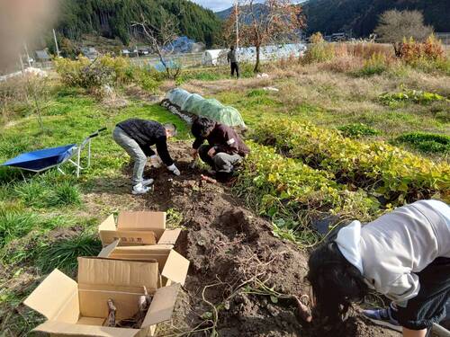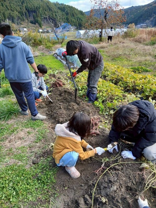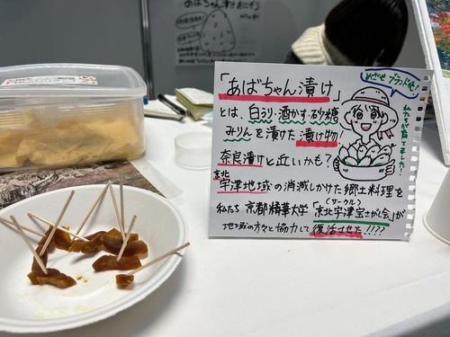 「漬ける、繋がる、紡ぎだす」。休耕地を開墾した畑での野菜の生産や、地域の伝統食「あばちゃん漬け」の復活に挑戦しています。展示では大学生による農地の維持管理や生産活動による農村風景の保全、また伝統食「あばちゃん漬け」の復活までの道のりを紹介しています。また、サツマイモの販売も実施します。